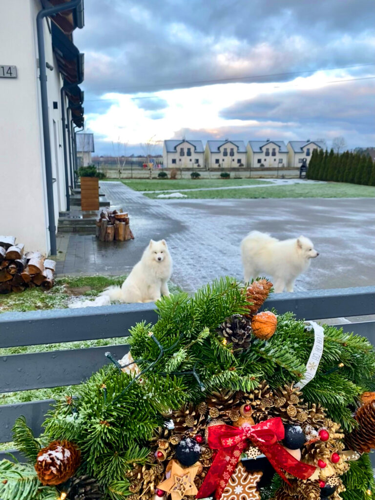 Sami jesteśmy właścicielami dwóch Samojedek: Fibi i Herci. Nasze dziewczyny obecnie już nie przybywają na terenie wspólnym. Ich codziennym wybiegiem jest plaża, następnie wyciszanie i odpoczynek na tarasie lub pod schodami w domku.